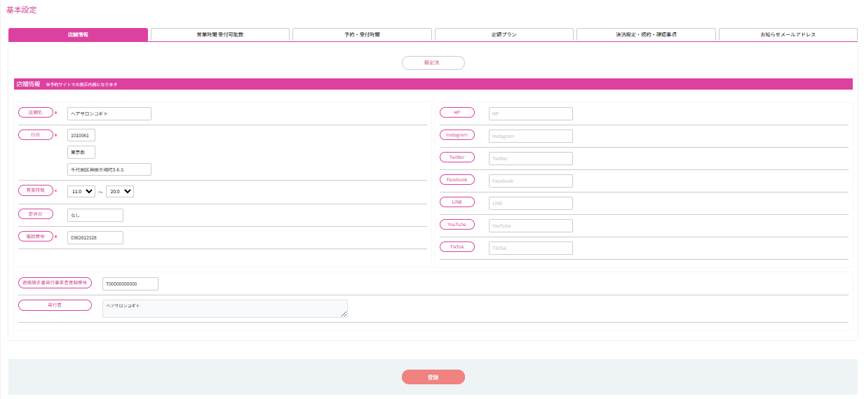 こちらで入力した内容が、予約枠およびシフト設定にも反映されます。