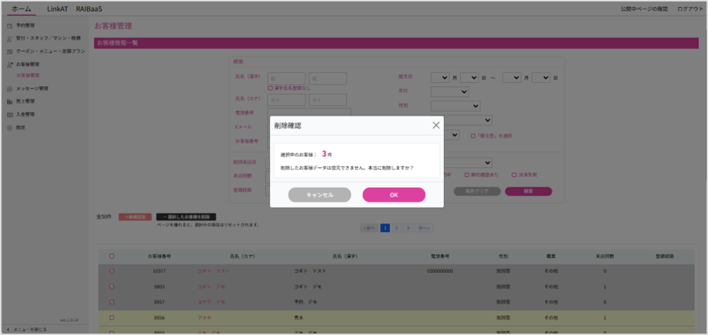 削除ボタンを押下後、選択したお客様の件数が表示されますので、問題がなければ「OK」を押下し、削除が完了です。