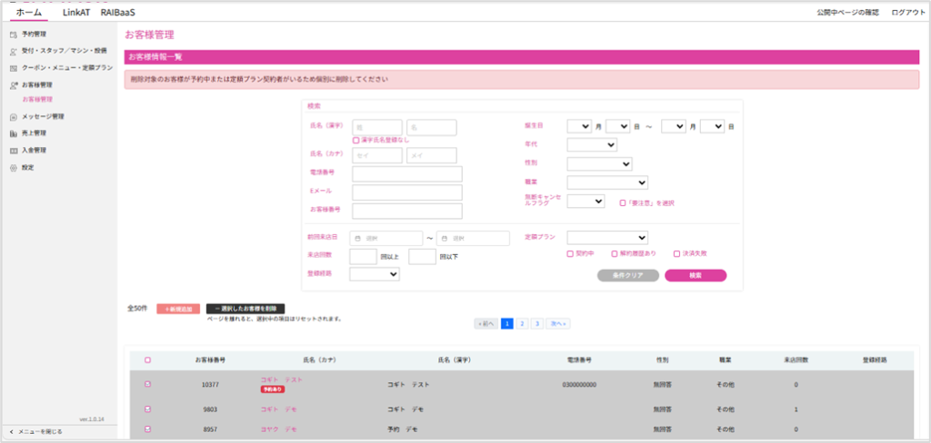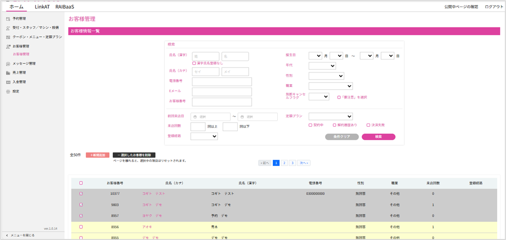 お客様管理画面を開くと、登録されているお客様情報が一覧になって表示されます。