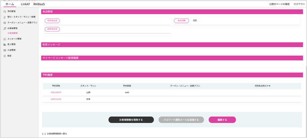LinkAT友だち情報画面では、プロフィールや過去の施術履歴などのメモを確認することができます。